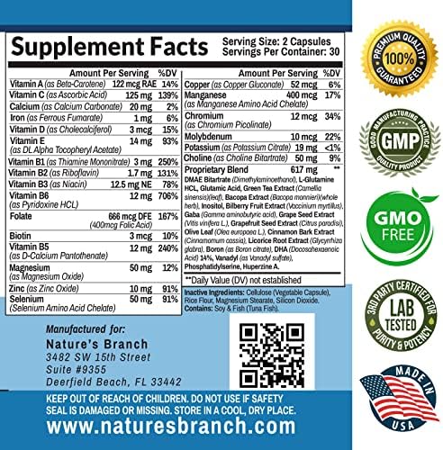 ✅ PROFESSIONAL GRADE & MADE IN THE USA Nature’s Branch non stimulant brain and memory boost power supplement contains the ultimate combination of clarity & brain vitamins for men and women. GMP CERTIFIED for SUPERIOR QUALITY, POTENCY & PURITY, our brain and memory enhancement caps are free from artificial ingredients & preserves. Our Brain Booster HEALTH FORMULA is designed for supporting brain cognition, focus & energy providing BETTER VALUE!*