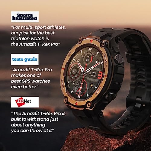 Amazfit T-Rex Pro Outdoor Men’s Smartwatch is designed to explore your Instinct. Military-grade toughness with 10 ATM Water-resistance, 70°C heat resistance, -40°C cold resistance,240 hours humidity resistance, and 96 hours salt spray resistance. Witness endurance that braves the elements with ease. Get a high-level exploration partner that boasts four Global Navigation Satellite systems, a weather tracker, a sunrise and sunset monitor, a current moon phase display, a compass, and a barometric altimeter. Ultra-long 18-day battery life with typical use, and over 100 different sports modes to track your every move. Protect your health and keep fit with heart rate, sleep quality monitoring, and blood-oxygen saturation measurement, and get personalized evaluations via built-in health assessment system PAI. This is a fitness watch that strikes the perfect balance between practicality and comfort–features an always-on 1.3-Inch HD AMOLED color screen for smoother touch operation and richer & brighter color, a skin-friendly silicone strap with a sweat-wicking design to ensure it stays dry and comfortable.