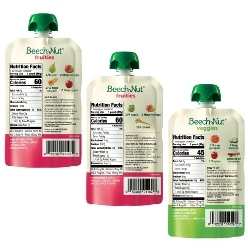 Beech-Nut Baby and Toddler Food Pouches are made with real ingredients, gently cooked and packed in convenient pouches for on-the-go feeding. This Beech-Nut Farmstand Blends Variety Pack contains (6) Pear, Mango Squash, (6) Apple, Mango Carrot, and (6) Pumpkin, Zucchini Apple baby food pouches. Our blends contain real fruits and veggies gently cooked with indirect heat to preserve flavor and nutrients. Beech-Nut baby food pouches are a delicious way to squeeze more fruits and vegetables into your little one’s day. This Stage 2 puree is ideal for your baby 6 months and up.
