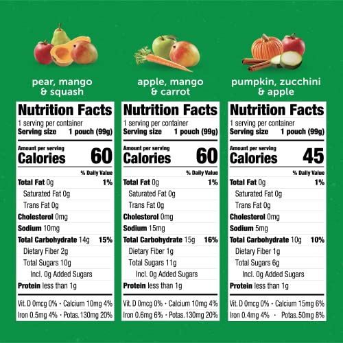 CONVENIENT POUCHES FOR ON-THE-GO: This variety pack comes with 18, 3.5oz squeezable pouches to easily feed your baby anytime, anywhere.