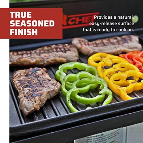 – True Seasoned Finish cast iron grill/griddle holds the heat and sears the meat to cook better