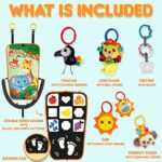 🚗FINE MOTOR SKILS – Comes with soft Teether, Beads with ring, lion plush with bell, monkey plush with squeaker sound, bird plush with black and white color. They are lovely hanging animal toys which will make interesting sounds to keep the baby busy.