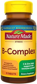 Nature Made Stress B Complex with Vitamin C and Zinc is a dietary supplement designed to help support your immune system. Sourced from high-quality ingredients, this gluten free stress supplement is made with no color added and no artificial flavors. This Vitamin B-complex supplement helps support energy metabolism(1) and provides B6, which supports the production of neurotransmitters needed for mood health. This Nature Made Stress B Complex provides all 8 essential B vitamins: thiamin (B1), riboflavin (B2), niacin (B3), pantothenic acid (B5), B6 (pyridoxine), biotin (B7), folic acid (B9), and B12 (cyanocobalamin). These Vitamin B complex immune support tablets also contain Vitamin C and E for antioxidant support, and Zinc to help support the immune system and normal growth development. Adults take one of these Nature Made Stress B-complex with Vitamin C and Zinc tablets daily with water and a meal. Nature Made supplements are quality you can trust. (1)Helps convert food into cellular enegy. *Based on a survey of pharmacists who recommend branded vitamins and supplements.