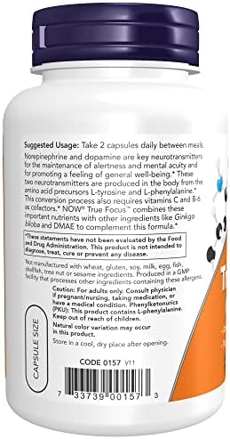 Norepinephrine and dopamine are key neurotransmitters for the maintenance of alertness and mental acuity and for promoting a feeling of general well-being.* These two neurotransmitters are produced in the body from the amino acid precursors L-tyrosine and L-phenylalanine.* This conversion process also requires vitamins C and B-6 as cofactors.* NOW True Focus combines these important nutrients with other ingredients like ginkgo biloba and DMAE to complement this formula.* Natural color variation may occur in this product.