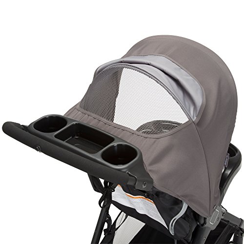An oversized canopy with flip-out visor and peek-a-boo window provides shade and airflow on sunny days and a convenient basket under the seat provides storage for baby items.