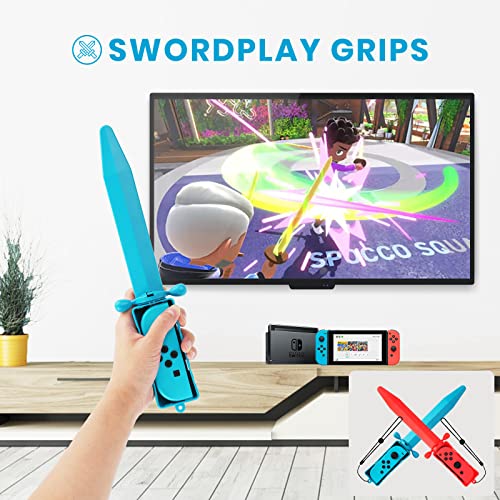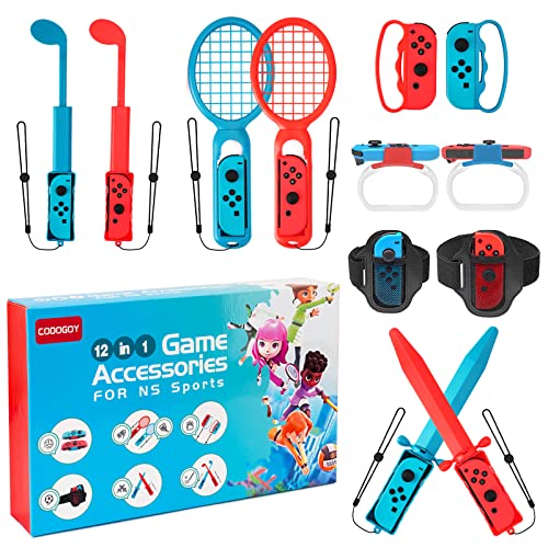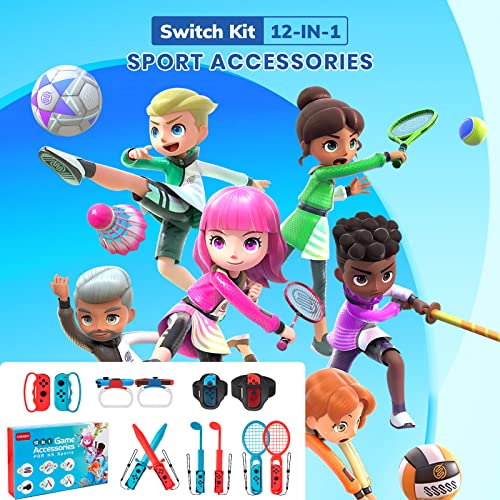 🏐【12 In 1 Accessories Kit for Switch Sports】: The switch accessories kit include whatever you need : 2 x golf clubs, 2 x tennis rackets, 2 x wrist bands, 2 * Sword, 2 x leg straps, 2 x Bowling Grips. The complete switch accessories kit saves your money and time on searching varieties accessories. Very suitable for parent-child sports.