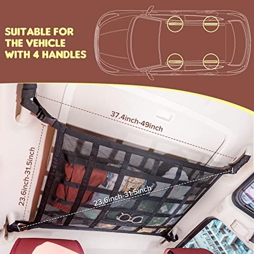 🚓【Lengthened fixed rope & Suitable for most Vehicle】 The fixing rope of the Kaskawise car roof storage organizer is lengthened to 25.98inch/66CM,size is 31.5 x 21.6 inches,it is suitable for ceiling net storage of 4 handles such as cars,Jeep,SUVs,and so on.Making it ideal for long-distance travel and camping.