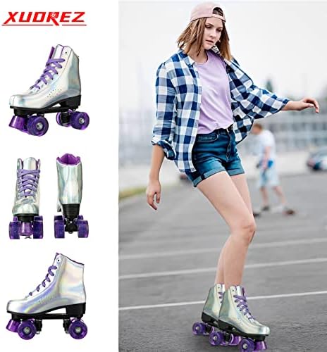 Home Skates XUDREZ Roller Skates for Women Girls, Stylish Laser Silver Roller Skates, Classic Double-Row High-top Roller Skates for Beginner, Indoor Outdoor Roller Skates