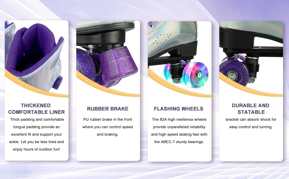 ❤【High-quality PU wheels】The wheels of XUDREZ roller skates are all high-quality PU wheels instead of ordinary PVC wheels, which are more wear-resistant, shock-absorbing, and have strong grip, and the wheels move more comfortably. The shiny wheels make you more cool in the skating! (no battery and power supply required)